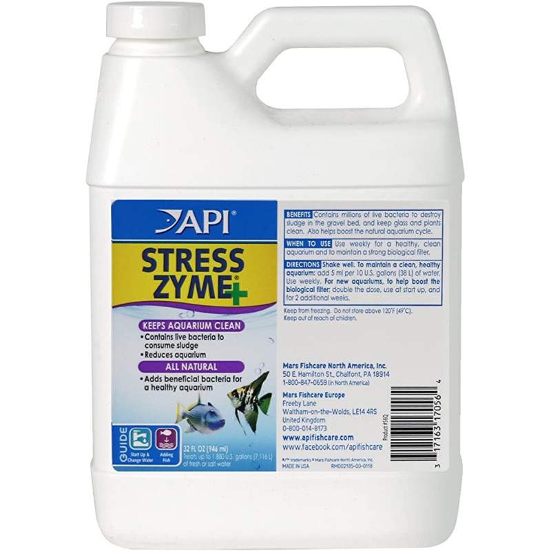 Το καθαριστικό βακτηρίων API STRESS ZYME περιέχει πάνω από 300 εκατομμύρια ζωντανά βακτήρια ανά κουταλάκι του γλυκού για κατανάλωση λάσπης και μείωση της συντήρησης του ενυδρείου, διατηρώντας το ενυδρείο σας καθαρό και βελτιώνοντας τον κύκλο του φυσικού ενυδρείου. Το να κάνετε το καθαριστικό βακτηρίων STRESS ZYME μέρος της τακτικής ρουτίνας συντήρησης της δεξαμενής σας διασφαλίζει ένα ενεργό βιολογικό φίλτρο, ένα καθαρότερο ενυδρείο, υγιέστερα ψάρια και καλή ποιότητα νερού. Αυτό το προϊόν μπορεί να χρησιμοποιηθεί σε ενυδρεία γλυκού και αλμυρού νερού.